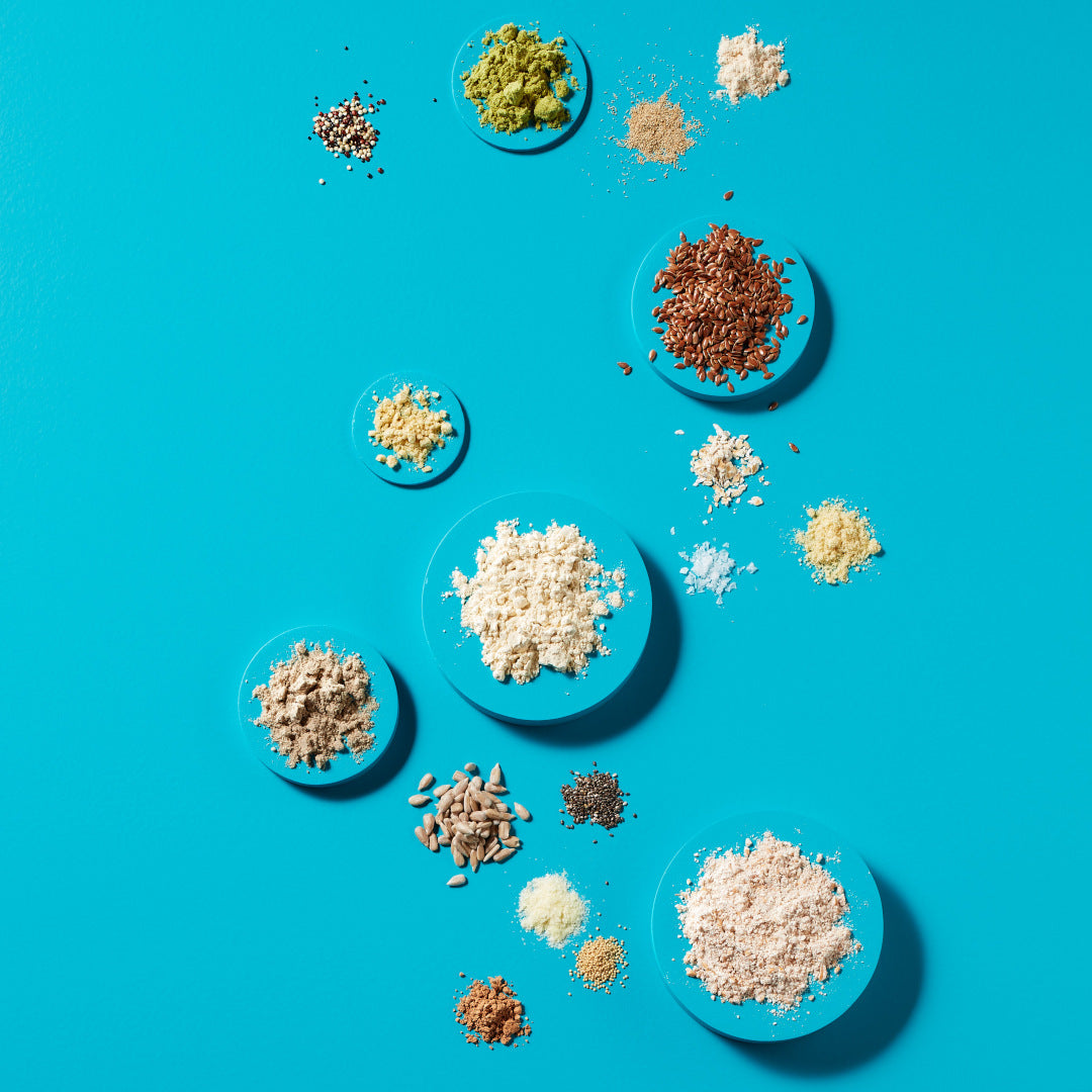 DINKELERZEUGNISSE (Vollkornmehl, Flocken), WEIZENEIWEIß, Leinsamen, Sonnenblumenkernmehl, Kürbiskernmehl, SOJASCHROT,