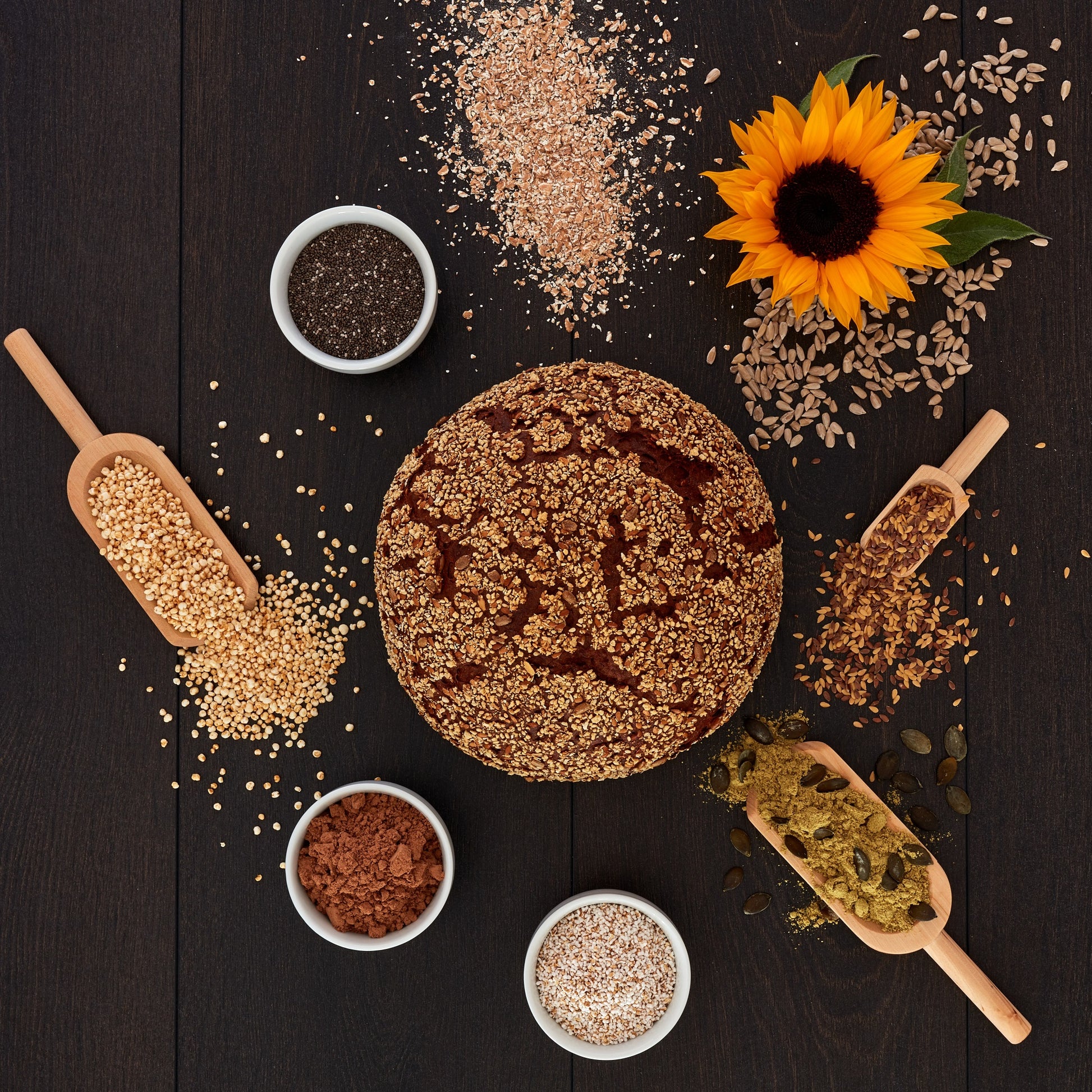 Sonnenblumenkerne, DINKELSAUERTEIG, Hefe, SOJAMEHL, Chiasamen, Kartoffelflocken, Salz, Quinoa gepufft, Haferpflanzenfaser, Traubenkernmehl, Amaranth gepufft
